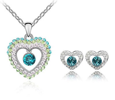 Contessa Bella Fancy Genuine 18k White Gold Plated Teal Blue Green and Clear Swarovski Austrian Crystal Elements Beautiful Jewel Open Heart Charm Pendant Women Necklace and Earrings Set Elegant Silver Color Crystal Fashion Jewellery AED149