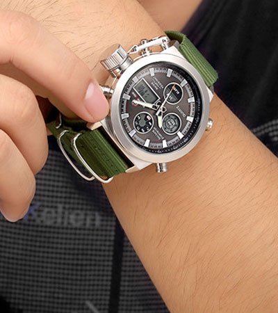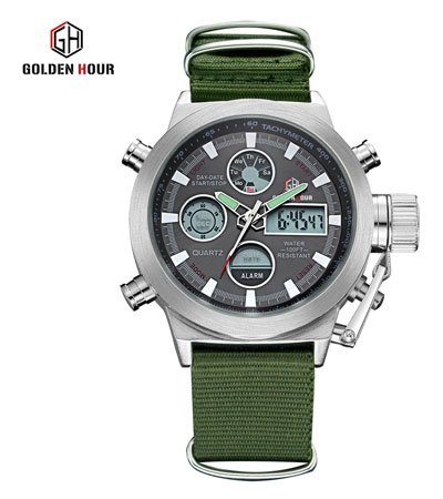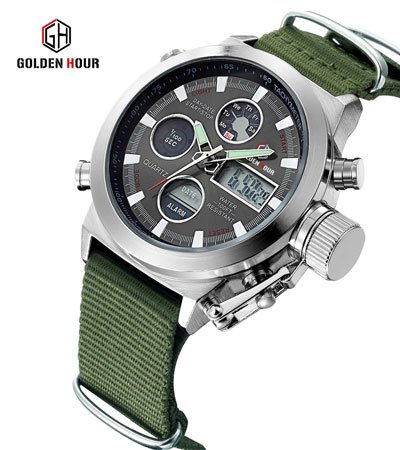 Golden Hour Fashion Brand Men Sports Watches with Nylon Strap Digital Analog Watch Army Military Waterproof Male LED Clock AED149 only
