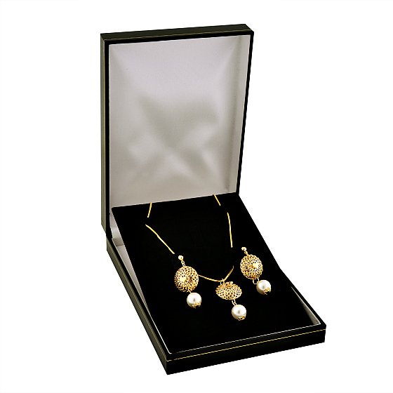Accentuate any outfit with this exquisite dangling pearl jewelry set. Crafted with highly polished gold plated steel.