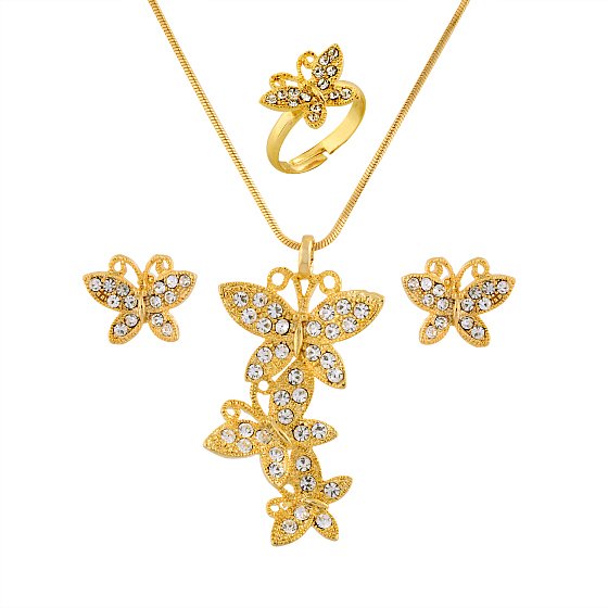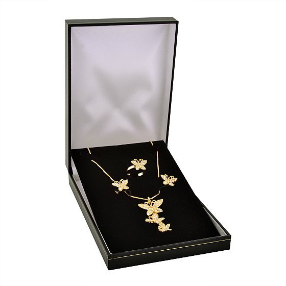 This jewelry set features a butterfly theme with cubic zirconia accent stones and a highly polished 14k goldplated finish.